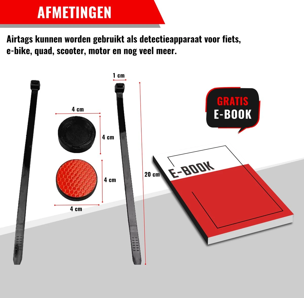 Met behulp van de AirTag fietshouder, de nieuwe tracker van Apple en het bijbehorende netwerk, kun je de diefstalbeveiliging van je eigen fiets verhogen. De AirTag houder kan worden gemonteerd aan uw zadel stang of onder uw zadel. De benodigde installatie materialen worden bij het product geleverd. Hierdoor kunt u het antidiefstalapparaat op alle fietsen of e-bikes gebruiken. De AirTag mount, is tegelijkertijd ook een reflector waardoor hij niet snel opvalt en dieven hem niet snel zullen stelen.