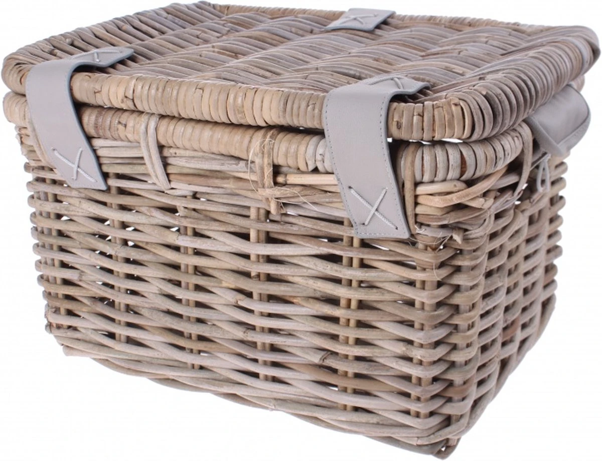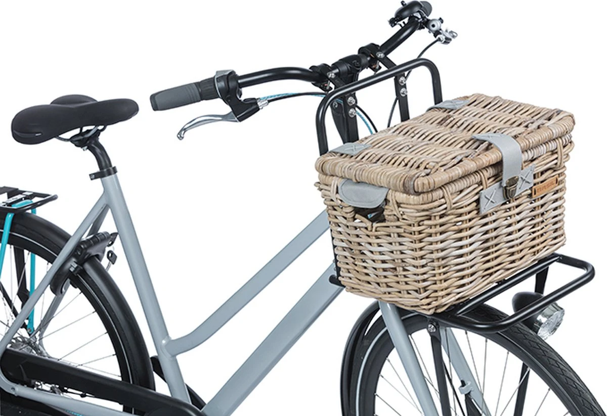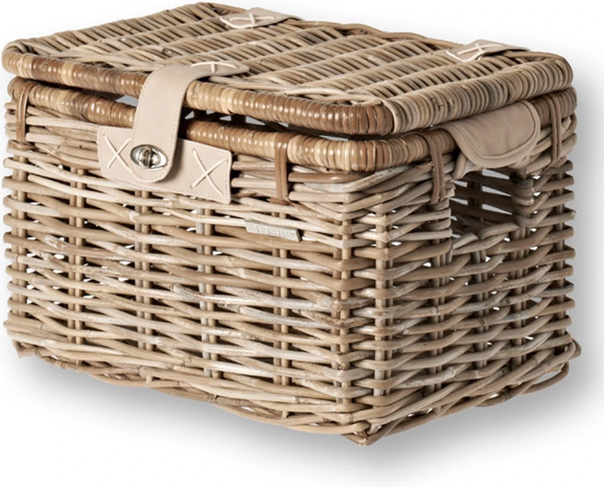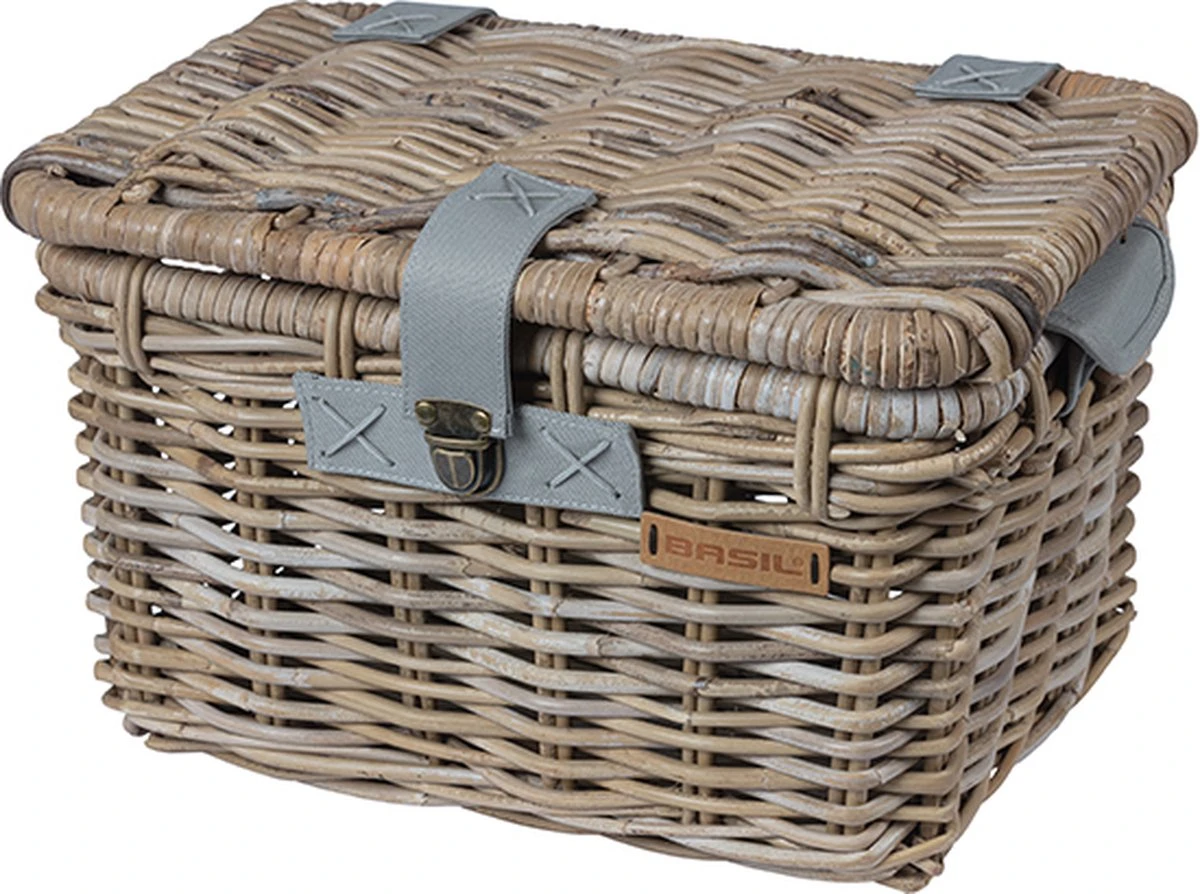De Basil Denton M is een luxe rotan opbergmand voor op een dames- of herenfiets en bovendien voorzien van een deksel met sluiting. De mand valt direct op vanwege de grijze kleur en een diversiteit aan details. Deze praktische opbergkoffer is een aanwinst voor het doen van je dagelijkse boodschappen of voor het vervoeren van je sporttas. De mand komt ook goed van pas bij een heerlijke picknick. Ideaal tijdens een fietsvakantie in de lente of bij mooi zomerweer. Het is een stijlvolle mand waarmee je zeker gezien mag worden. De handgrepen en kunstlederen details geven de koffer een luxe uitstraling. Deze rotan fietsmand wordt geleverd zonder bevestigingsmateriaal, maar kun je monteren op de voordrager van je fiets in combinatie met een crate mounting set die apart dient aan te schaffen. De leren handvatten maken het mogelijk om de fietsmand overal mee naartoe te nemen. Wil je een exclusieve rotan fietsmand van goede kwaliteit? De Basil Denton M is zeker een slimme keuze. Bekijk ook zeker de andere opbergkoffers en fietsmanden van het merk Basil. De mand is gemaakt van natuurlijk rotan materiaal. Hierdoor heeft de mand niet alleen een mooie uitstraling maar is deze ook nog eens milieuvriendelijk, licht van gewicht en toch sterk. Wij kiezen voor de beste biologische soorten rotan en wilgenteen soorten maar het blijft een natuurproduct. Dit betekent dat het materiaal gevoelig is voor weersinvloeden. Daarnaast kunnen de afmetingen van de mand 1 – 2 cm variëren. Binnenmaat L 36 x B 23 x H 20 cm Buitenmaat L 39 x B 27 x H 25 cm Eigenschappen: De rotan fietsmand monteer je eenvoudig op je fiets met een crate mounting set. De mand heeft een luxe uitstraling dankzij de kunstlederen details. Deze praktische opbergkoffer komt voor diverse doeleinden goed van pas en is daarom ideaal voor zowel mannen als vrouwen. Het deksel met sluiting voorkomt dat je spullen of boodschappen op straat komen te liggen. Je vervoert daardoor altijd veilig je bagage.