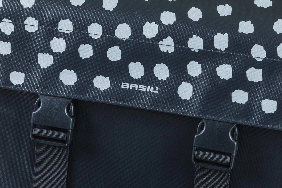 De Basil Urban load fietstas is een dubbele fietstas die door het (reflecterende) stippenpatroon lekker vrouwelijk en stijlvol oogt. De fietstas is onder andere gemaakt van polyester en waterafstotend tarpaulin. Zo blijven je spullen droog bij een regenbui, als je de boodschappen gaat doen of een rondje maakt door jouw bruisende stad. De vouwsluiting voorkomt het inregenen. De dubbele fietstas heeft een ruime inhoud tot maar liefst 53 liter. Soms best handig ingeval je met een tas vol nieuwe kleding thuis komt (oeps), in plaats van alleen die nieuwe schoenen die je écht nodig had. Als de tas leeg is, is deze compacter of smaller te maken door de flexibele zijkanten. Hierdoor kun je jouw fiets makkelijker kwijt kan in die overvolle fietsenstalling bij het station. De Urban Load is voorzien van het Basil Universal Bridge System waardoor deze op alle bagagedragers past (ook e-bikes) en gecombineerd kan worden met bevestigingssystemen als Racktime en i-Rack/Carrymore. Bovendien is er een model met reflecterende print, voor nog meer zichtbaarheid. De Basil Urban load is in meerdere kleuren beschikbaar, gebaseerd op de colorblock trend. Zo is er een groen met witte variant, grijs met (goud)geel en een zwarte Basil Urban Load tas. Neem hier eens een kijkje voor de gehele Basil Urban Load collectie. Eigenschappen: De reflectiestippen en -details maken je beter zichtbaar. De fietstas is ook geschikt voor Racktime, i-Rack of Carrymore platen door het Basil Universal Bridge System. De tas is gemaakt van waterafstotend materiaal, waardoor de tas prima tegen een regenbui kan maar zal na een dag in de regen niet meer kurkdroog zijn. Als de tas leeg is, is deze compacter/smaller te maken door de flexibele zijkanten. De verstelbare kliksluitingen zorgen ervoor dat je de tas naar gewenste hoogte kan vullen.