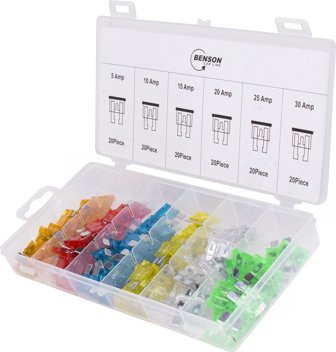 Deze handige back-up set bevat 120 plastic zekeringen, 20 stuks van de meest gebruikte zekeringen voor auto, motor, vrachtwagen, boot en andere motor aangedreven apparatuur van 5 ampère tot 30 ampère. Voor een beter overzicht van de doos sorteren is het label in het deksel met de grootte gegevens van de zekeringen. De doos heeft een kleine tab voor het eenvoudig ophangen. De doos heeft afmetingen (L × b × h) van 23 cm × 11 cm × 3 cm en weegt ongeveer 250 gram geleverd met de volgende zekeringen.
