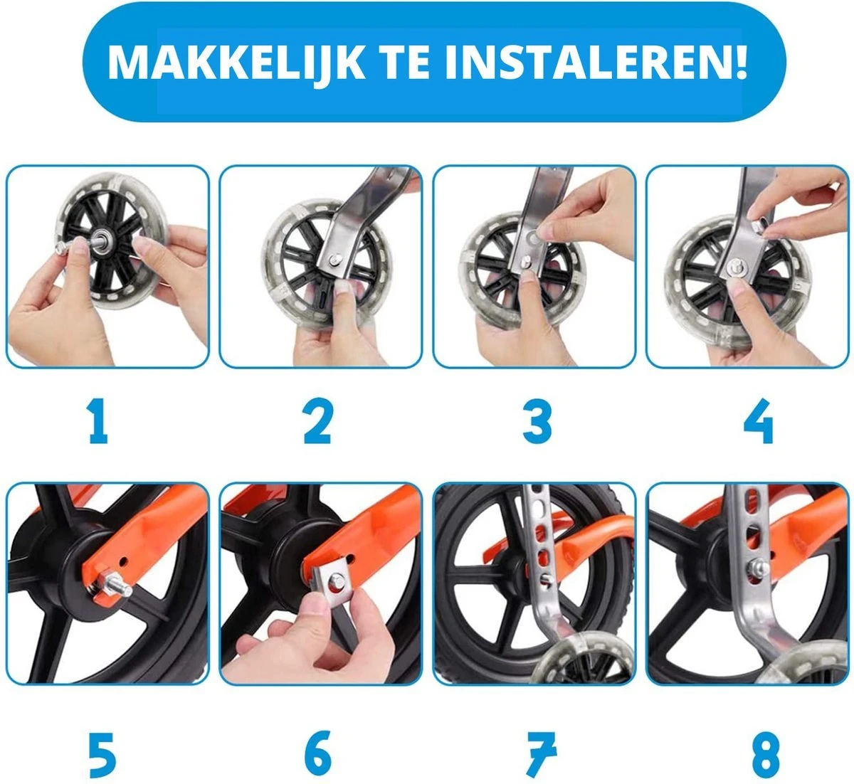 - [Antislip en geluidsarm] – onze fietshulpwielen bestaan uit hoogwaardige metaal-, kunststof- en rubbermaterialen. Ze zijn antislip en geruisloos, zodat je kind tijdens het rijden zonder zorgen veiliger en stabieler kan zijn.