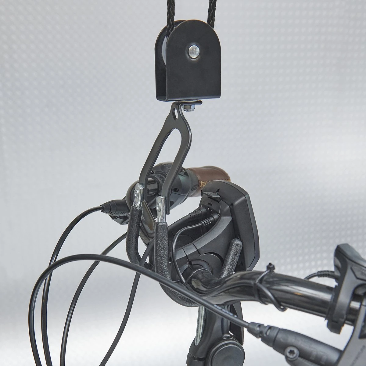 De fietslift wordt geleverd met 2 katrolrekken, 2 haken, 1 touw, 2 kajakriemen, en 8 schroeven.