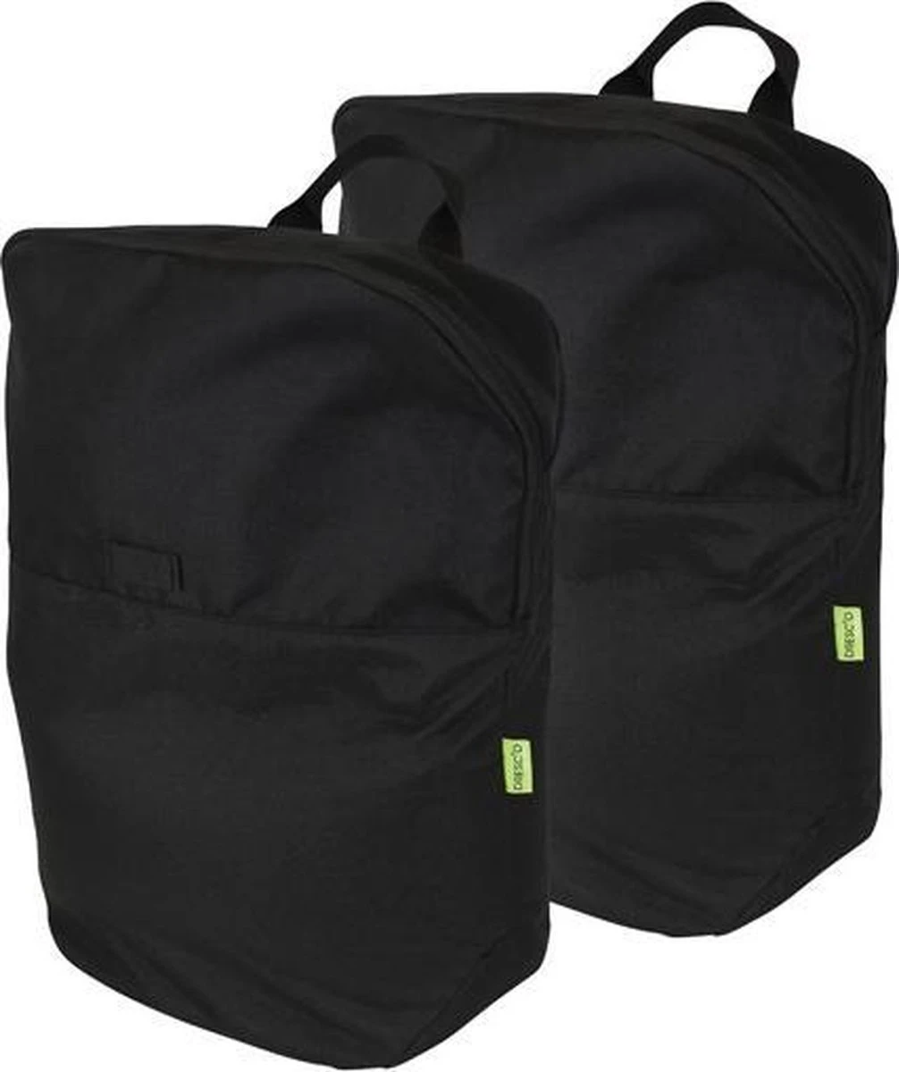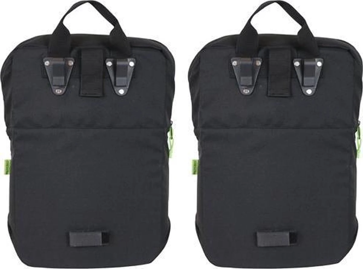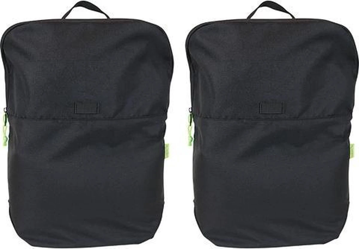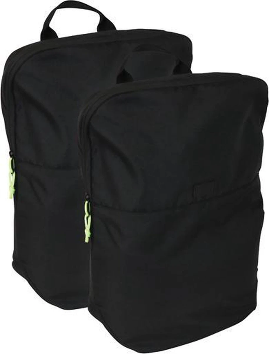 Deze twee zwarte pakaftassen hebben een ritssluiting. De tassen zijn gemakkelijk aan de bagagedrager te bevestigen door de clips op de achterzijde. Het handvat zorgt ervoor dat de tassen gemakkelijk te dragen zijn. De fietstassen zijn gemaakt van waterafstotend nylon en hebben een verstevigde rug. Daarnaast zijn de tassen voorzien van een bevestigingsmogelijkheid voor draagbare lampjes.