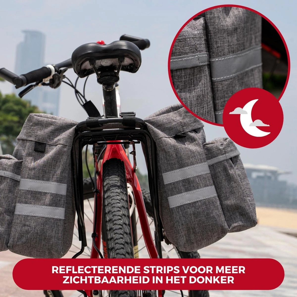 Door het hoekige tasontwerp is de tas uitstekend voor elke fietsrit. De tas is makkelijk te bevestigen en daardoor ook makkelijk weer los te maken wanneer je de tas mee naar binnen wilt nemen. De tas kan worden bevestigd met de vier bevestigingsbandjes. Deze bandjes zijn verstelbaar en daardoor voor vrijwel elke bagagedrager geschikt. Daarnaast zit er boven op de tas een handvat bevestigd waardoor de tas makkelijk gedragen kan worden. Beide zijdes hebben een versterkt achterpaneel, zodat de fietstas niet tegen de spaken aanschuurt. Ten slotte kan de tas dicht worden gemaakt met de ritssluitingen, dit zorgt ervoor dat je spullen extra veilig vervoerd kunnen worden.