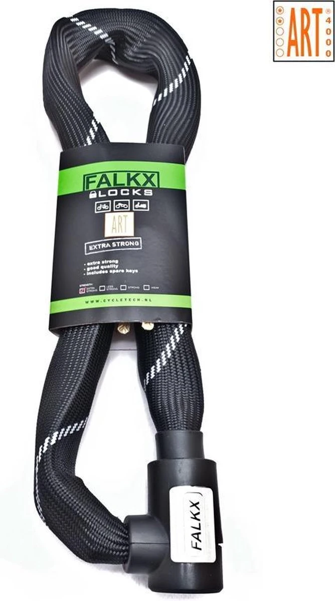 Dit kettingslot van Falkx is een kwalitatief hoogwaardige ketting, speciaal ontwikkeld voor gebruik bij duurdere fietsen en voor langdurig parkeren.