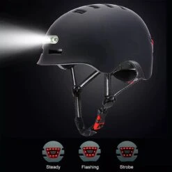 Fietshelm – Met Voor- En Achterlicht-Skatehelm – Maat-L 58-61cm-Helm Mat-Zwart – LED Verlichting