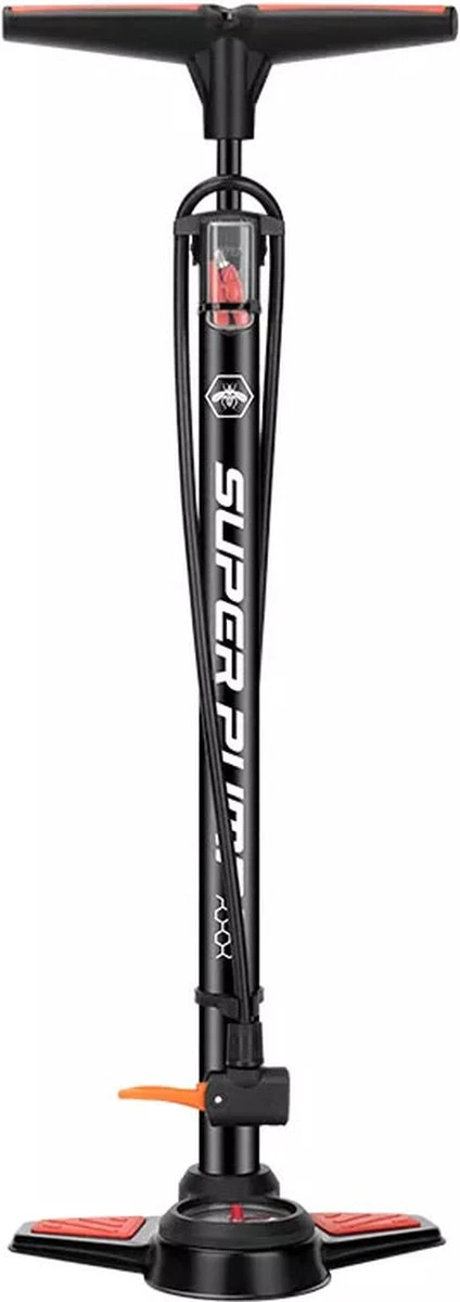 Deze staande fietspomp is een vloerpomp die je met de hand bedient. Hij heeft een dubbel ventiel. Met deze 2 verschillende openingen is de pomp geschikt voor 3 soorten ventielen: