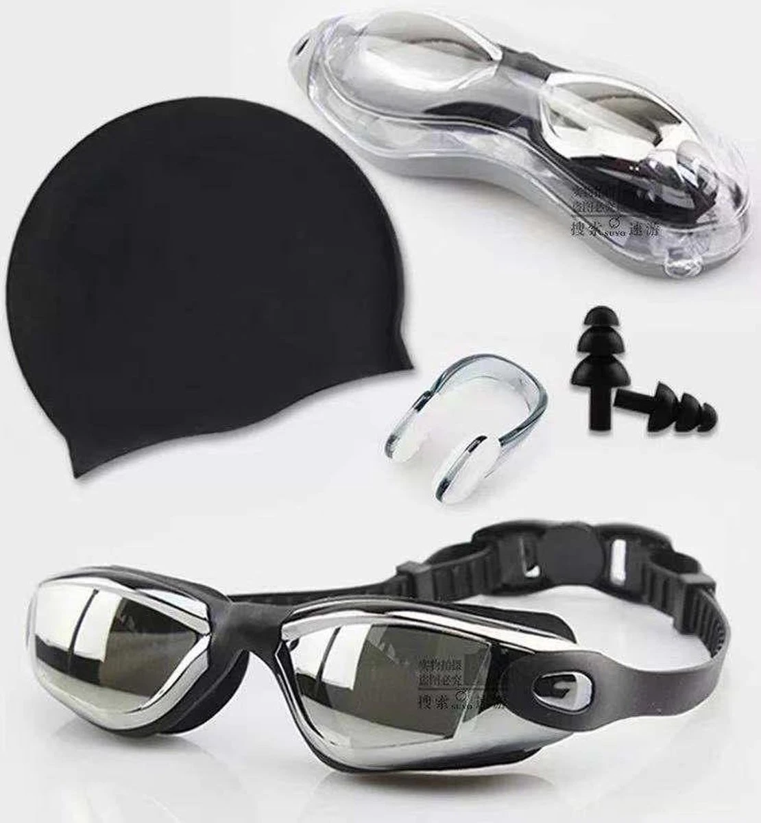 Naast een duikbril, bevat de set ook andere accessoires die van pas kunnen komen bij het zwemmen. De neusklem houdt water uit de neus, zodat u zich kunt concentreren op het zwemmen. De neusclip is gemaakt van zachte siliconen, die comfortabel op de neus zitten. Daarnaast bevat de set nog een badmuts en oordopjes. De oordopjes voorkomen dat er tijdens het zwemmen water in uw oren komt en verminderen de kans op een oorontsteking.