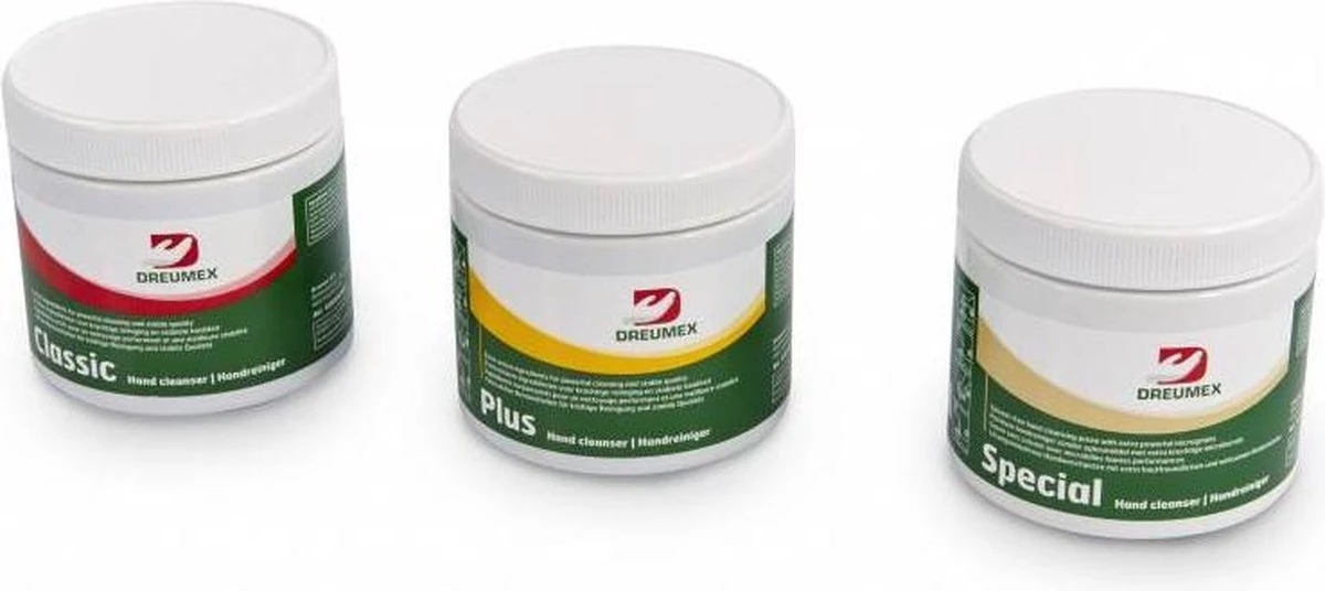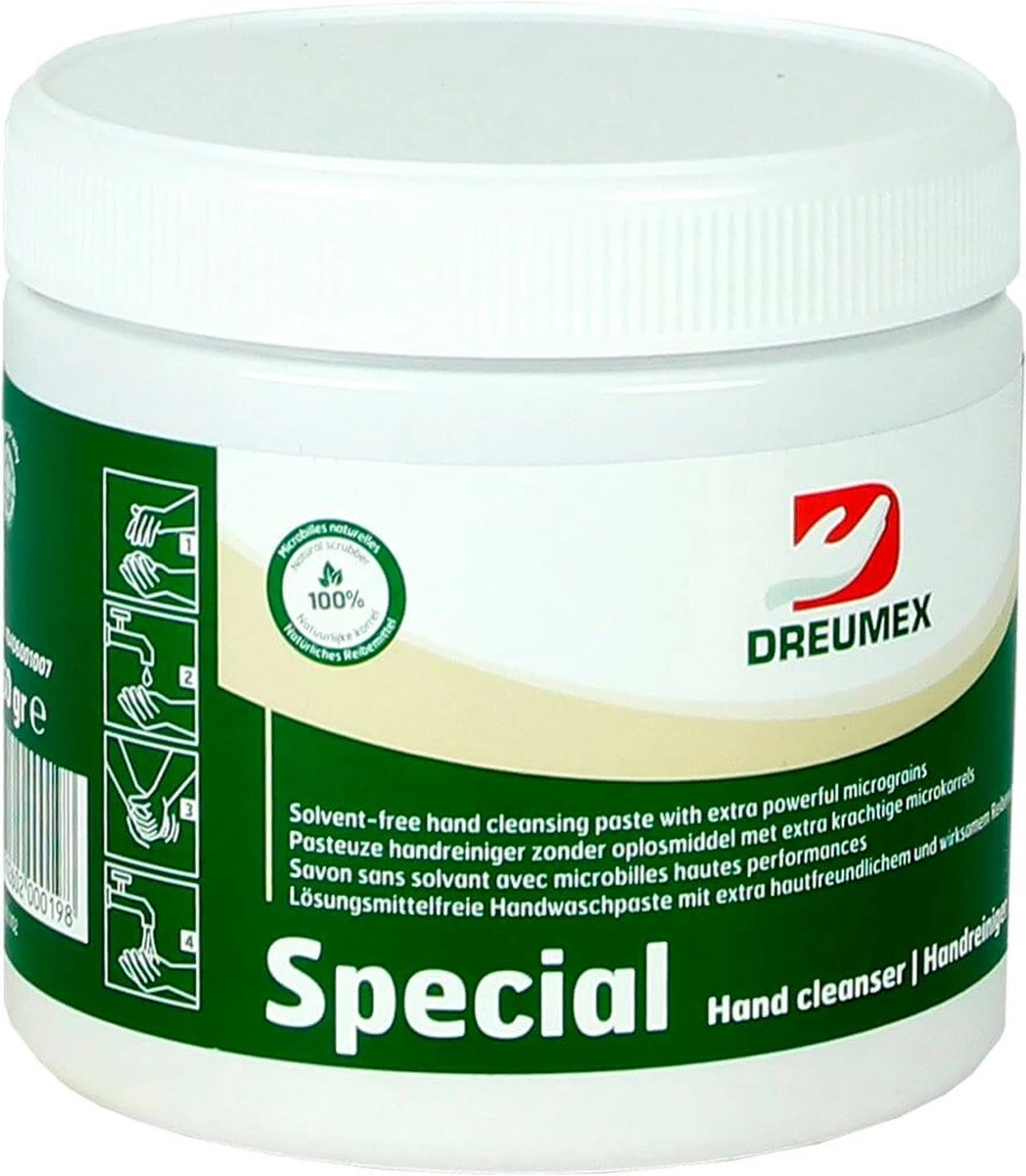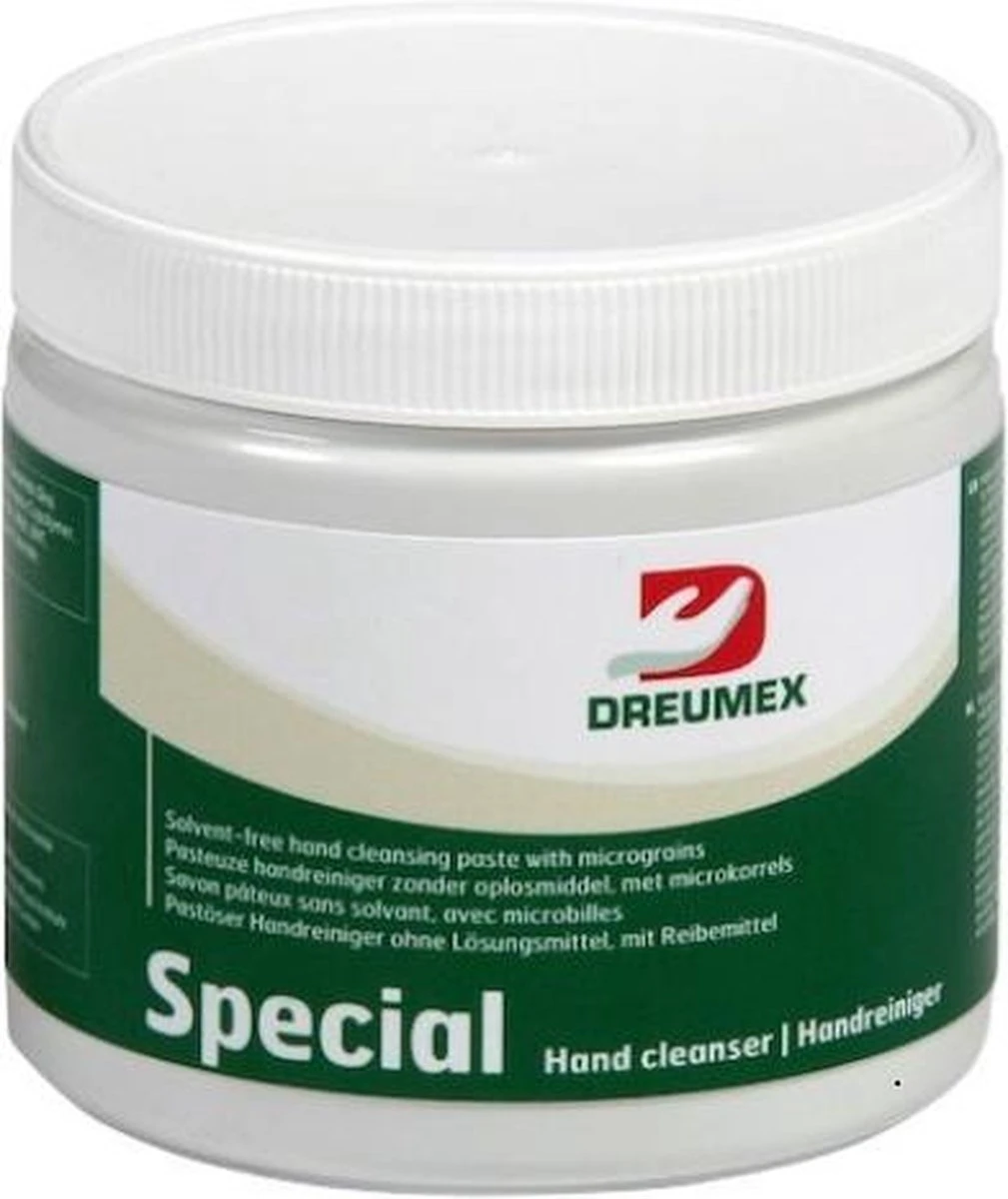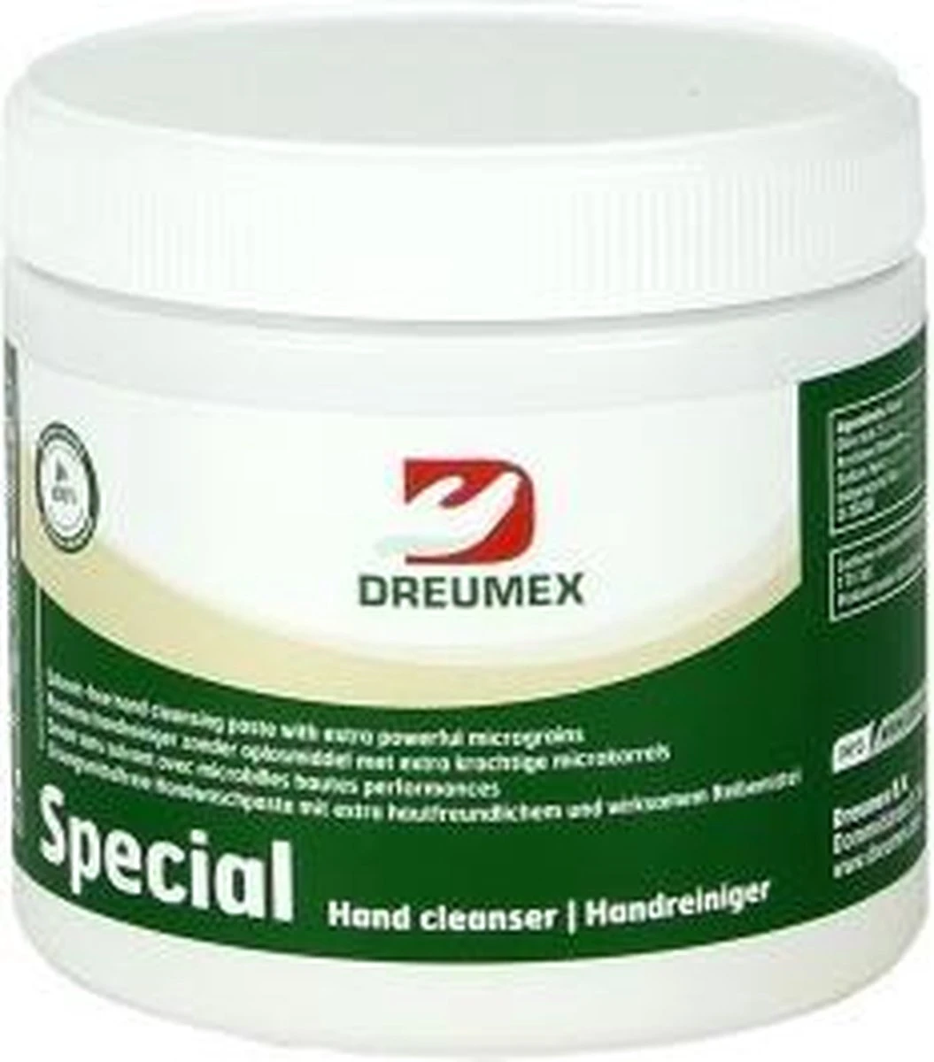 Dreumex Special handreiniger De Special handreiniger van Dreumex is een verdikte handreiniger die toepasbaar is op middelzware tot zware vervuilingen zoals smeermiddelen, diesel, remvloeistof, cement en roest. De Special is geschikt voor gebruik in de fietsindustrie, maar ook in de automobiel-, bouw- en metaalindustrie. Specificaties: Kleur verpakking: wit, groen Kleur handreiniger: rood Geslacht: unisex Materiaal verpakking: kunststof Gewicht: 550 gram