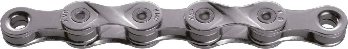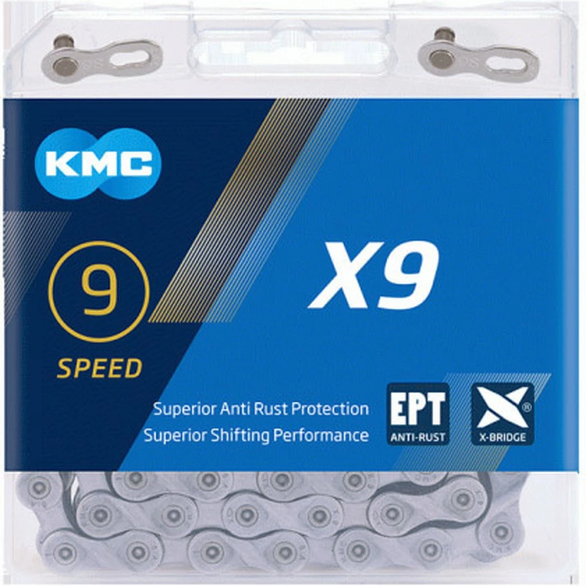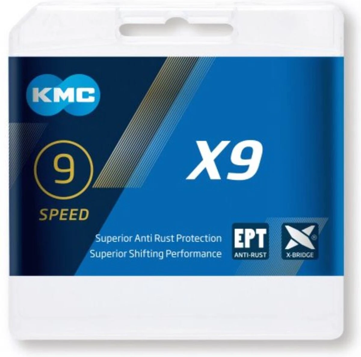 Dit is de nieuwe KMC 9 speed zilvere anti roest fietsketting. Deze ketting weegt 288 gram en bestaat uit 114 schakels. De ketting wordt standaard geleverd met een Missinglink. De ketting is geschikt voor Shimano, Campagnolo en Sram.