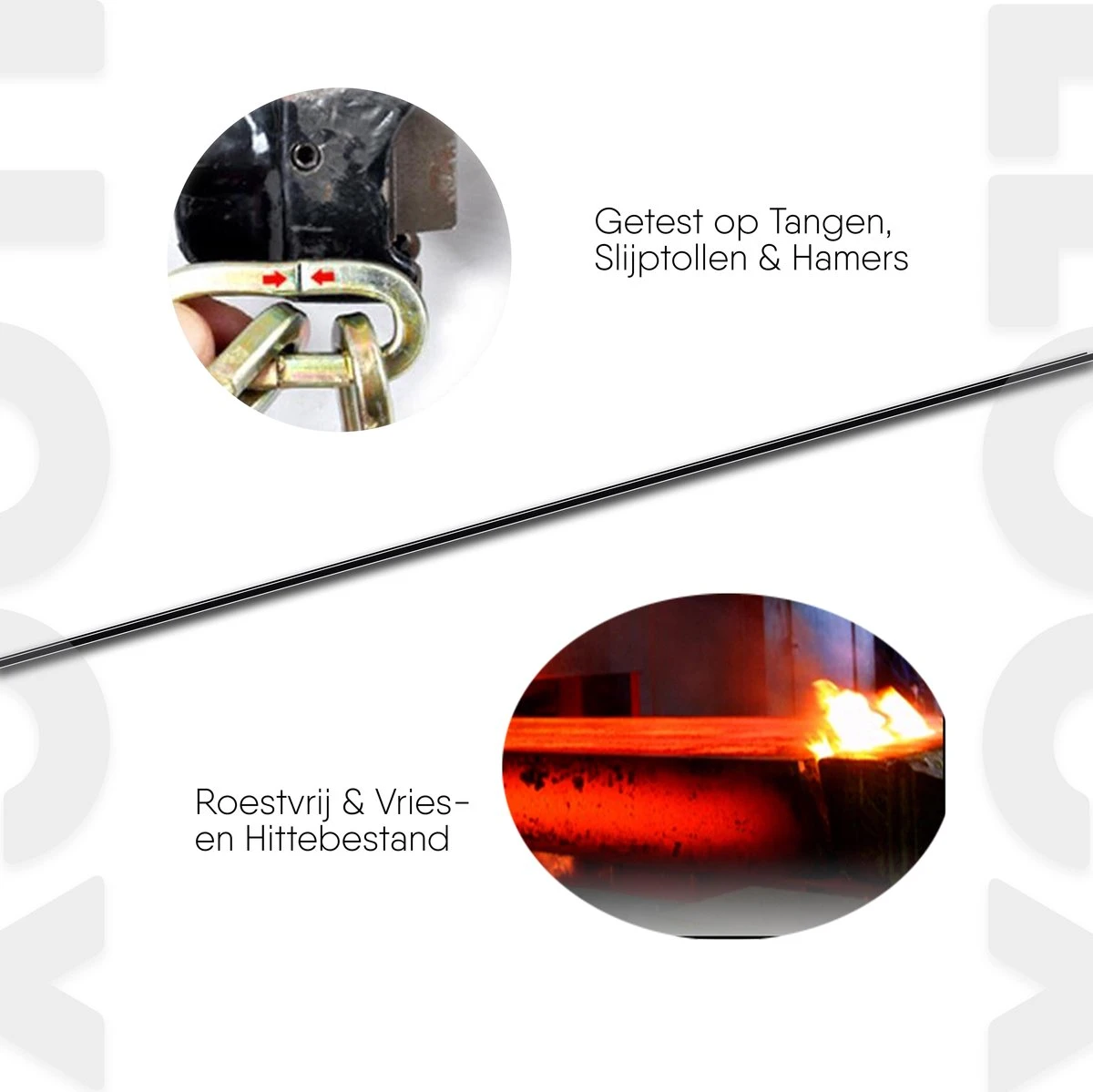 Extra veilig dankzij de dikke 6mm roestvrij gelegeerd stalen ketting, Zwitsers slot en sleutelgat beter bestand tegen blanco lopers door de 2 unieke Zwitserse sleutels. Makkelijk mee te nemen dankzij het gelegeerd aluminium staal = 1000gr. lichtgewicht.