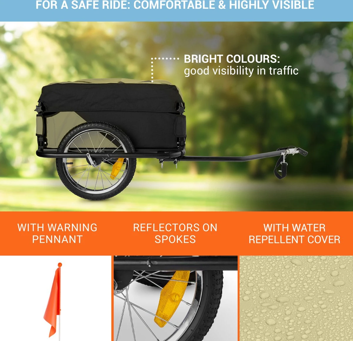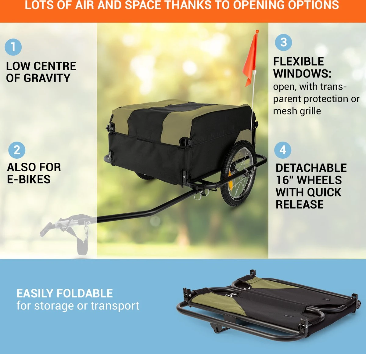 Voor de veiligheid van het wegverkeer zorgt de meegeleverde rood-oranje waarschuwings wimpel op een 145 cm lange vlaggenmast en twee lichtgevende spaakreflectoren in de 16 “wielen. Deze laatste worden gevuld met lucht en kunnen in elk tankstation met verse druk zonder een luchtpomp wordne opgepompt.