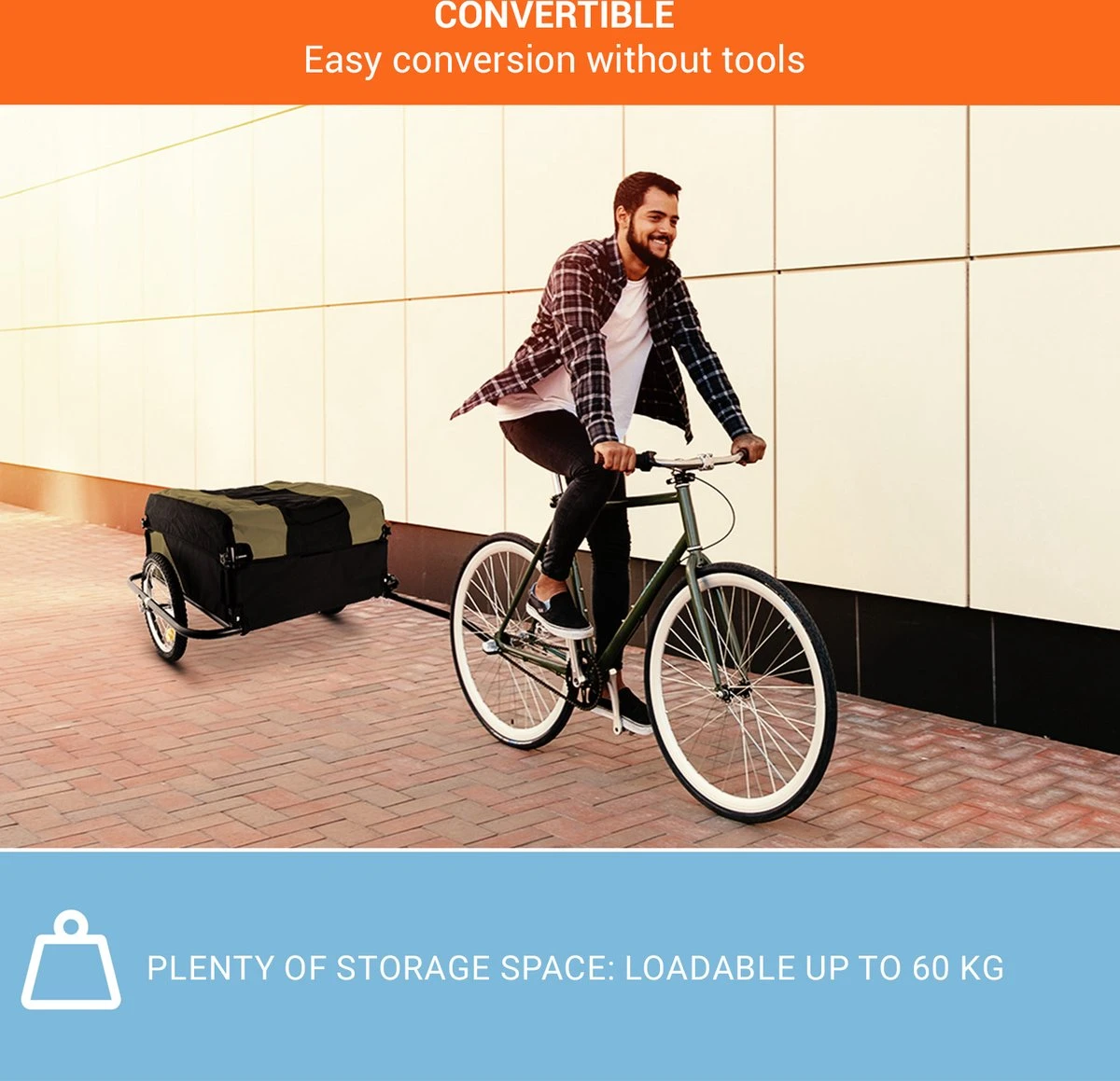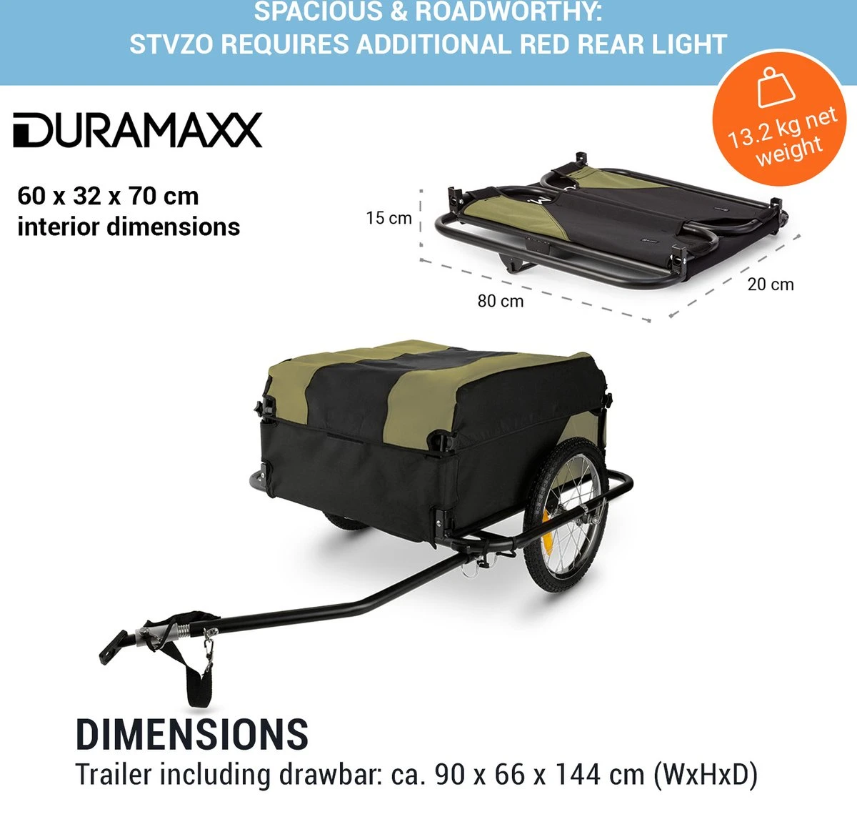 De fiets-aanhanger Mountee van DURAMAXX is uw specialist als het gaat om het verplaatsen van grote ladingen met de fiets – naar de supermarkt, op de weg in de tuin, naar de volgende picknick of zelfs een grotere fietstocht. De 130-liter grote laadruimte zorgt ervoor dat er heel wat bagae worden meegenomen. Daarvoor zorgt het stabiele stalen buizenframe. Geen vervelende autoritten meer want voor korte transportafstanden gebruikt u nu de DURAMAXX Mountee fiets-aanhanger: Om uzelf te redden van de stressvolle zoektocht naar een parkeerplaats, verkeersopstoppingen te verminderen en uw conditie te verbeteren. De lading wordt met een nylonhoes die over het frame gespannen in geval van regen.