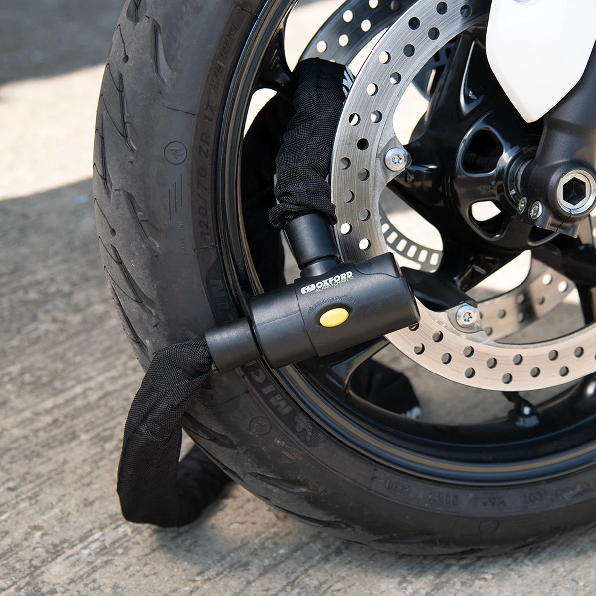 Met dit kettingslot met alarm bent u er zeker van dat u uw fiets of scooter veilig kunt achter laten. Door de robuuste constructie van gehard staal en vierkante schakels van 10mm wordt het bijna onmogelijk voor dieven uw fiets, scooter, e-bike, aanhanger, boot of motorfiets mee te nemen.