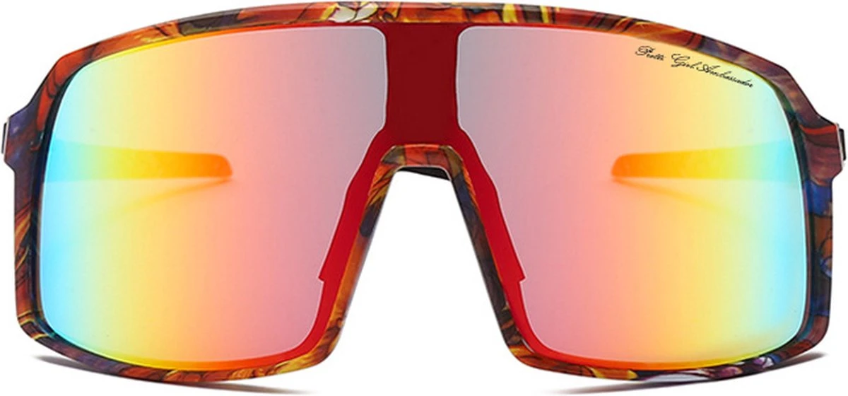 Dit is een meerkleurig montuur met een goud rood gespiegelde lens.